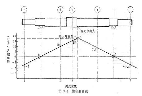 (6)将同一轴向断面的弯曲值 , 列入直角座标系。纵座标表示弯曲值 , 横座标表示轴全长和各测量断面间的距离。根据向位图的弯曲值可连成两条直线,两直线的交点为近似最大弯曲点 , 然后在该点两边多测几点 , 将测得各点连成平滑曲线与两直线相切,构成一条轴的弯曲曲线 , 如下图所示。