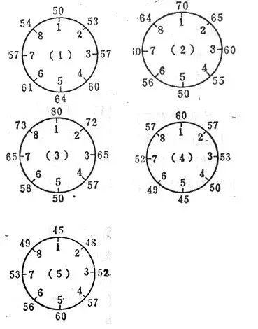 (4)将轴按同一方向缓慢地转动 , 依次测出各点读数 , 并作好记录 ,下图共有5个测量断面 , 每个断面测 8 点 。测量时各断面应测两次 , 以便校对 , 每次转动的角度应一致 , 读数误差应小于 0.005mm。