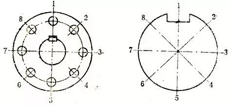 (2)将轴的端面分成若干等份( 一般为八等份)。带联轴器的轴,可按联轴器的螺栓孔等分 , 如下图(a); 没有联轴器的轴,以键槽为起点等分 ,如下图(b);并作上永久性记号。等分点作为测点 , 以后的一切测量记录都应与这些记号一致 。