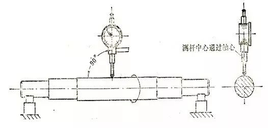 (3)将百分表装在测量位置上(最好在每个测段都装一百分表), 测量杆要垂直轴线 , 其中心通过轴心 , 如下图所示 ,将表的大针调到 “5 0 ” 处 , 把小针调到量程中间 , 然后缓缓将辅转动一圈 , 表针应回到始点 。