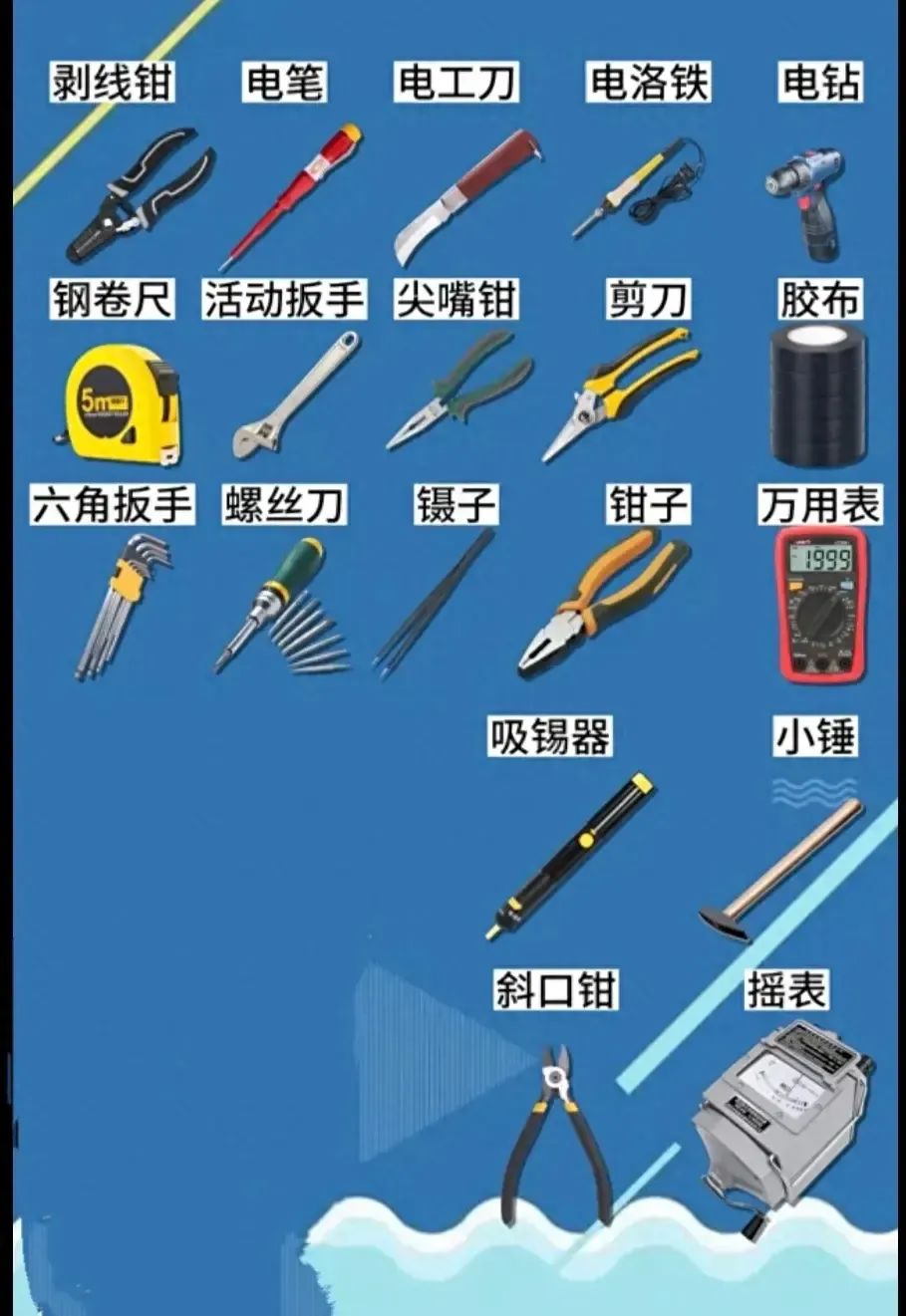 1、电工常用的电工工具(你认识多少)2、PPR常用配件名称(你会遇到这些吗)3、铜芯导线如何选择线鼻子(这表够清楚吧)4、丝锥孔径对照表(你学电工会攻丝吗)5、三相电机接线方法_星形_角型6、内六角螺铨尺寸表(以后看到内六角螺栓知道大小了吧)7、常用螺母规格尺寸(拧了那么多螺母你知道都是多大的)8、常用螺栓螺母名称(看到不认识的螺栓对照以下表)9、灭火器分类使用(关键要知道着火了该用那种灭火器)10、电缆颜色使用代码(看了这张知道颜色代码代表什么了吧)11、电缆铜铝鼻子(作为电工你能叫出名字吗)12、空气开关四兄弟(虽然长得一样,但是用途不一样)13、单相电、三相电、两相电(这应该应该吧)14、交流和直流的区别(看了这张图你应该懂了)15、如何辨别电缆好坏(这项本领一定要会)16、变压器分合闸安全顺序(这个很重要)17、接触器运行中有时产生很大噪声(你认为还有什么原因)18、电子元器件的介绍(应该很详细了吧)19、认识常见实物图形符号(这个够直观吧)20、认识常见实物图形符号(这个没问题吧)21、网线接水晶头方法(收藏吧压接一两次你是记不住的)
