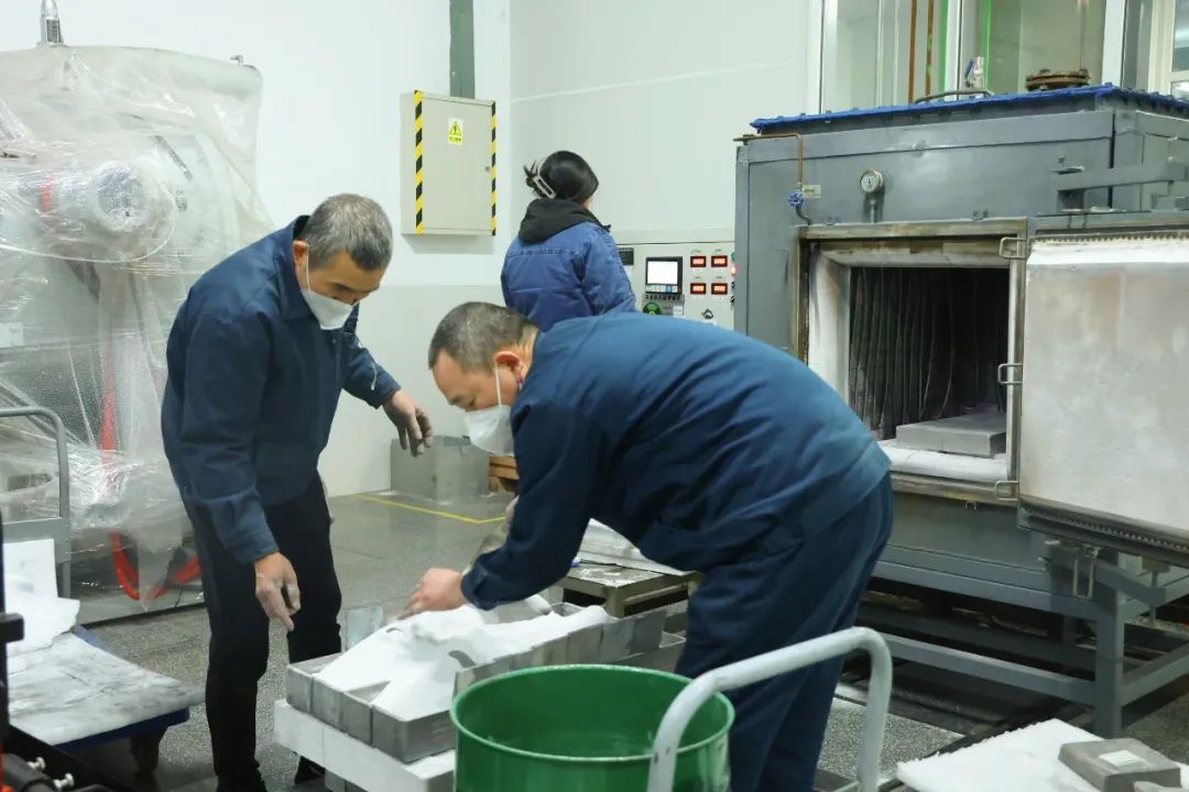 成都虹波丝杆班组员工正在埋氧化铝沙入箱式炉进行烧结。