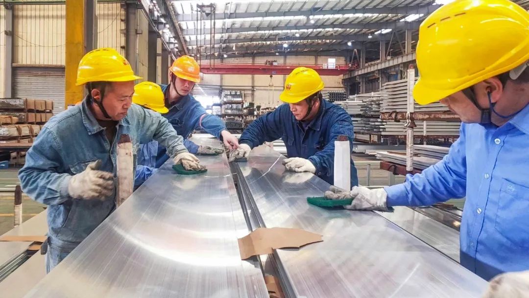 南平铝业特材事业部生产部员工正在对产品表面进行仔细打磨除湿,确保产品满足客户要求。