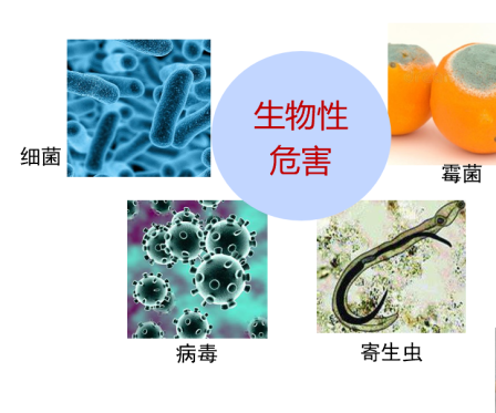 食品中生物性危害指生物(尤其是微生物)本身及其代谢过程、代谢产物(如毒素)、寄生虫及其虫卵和昆虫对食品原料、加工过程和产品的污染。常见的生物性危害包括细菌、病毒、寄生虫以及真菌。