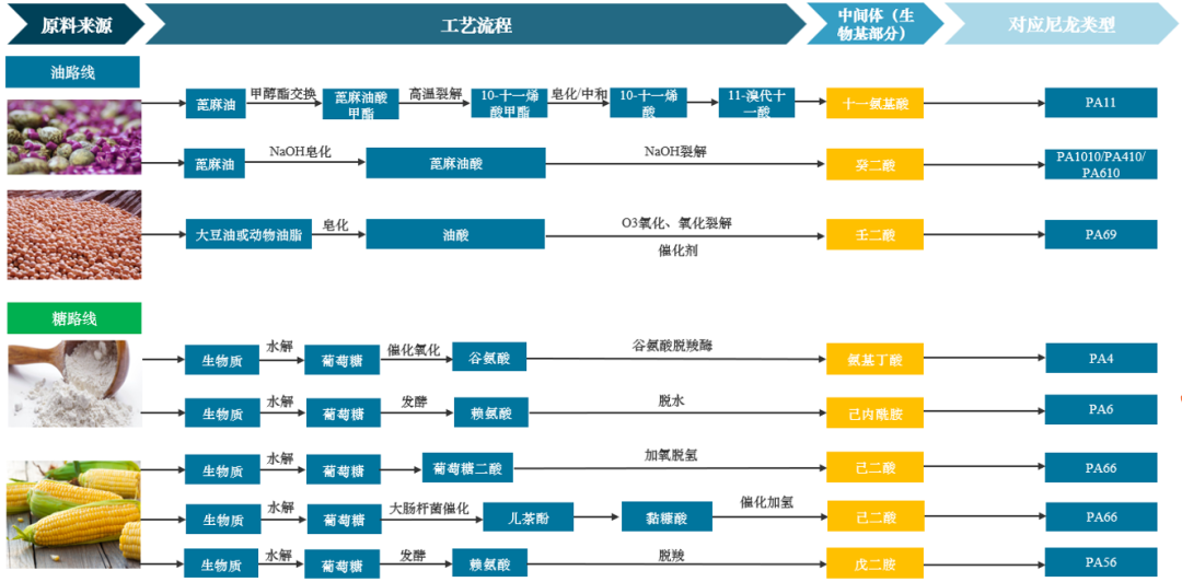 从生产工艺上看,生物基尼龙以玉米和甘蔗等生物质可再生资源为原料,通过生物、化学及物理等手段制造用于合成聚酰胺的单体,包括生物基内酰胺、生物基二元酸、生物基二元胺等,再通过聚合反应合成的高分子材料,主要合成工艺有油路线和糖路线,减碳效果十分显著。