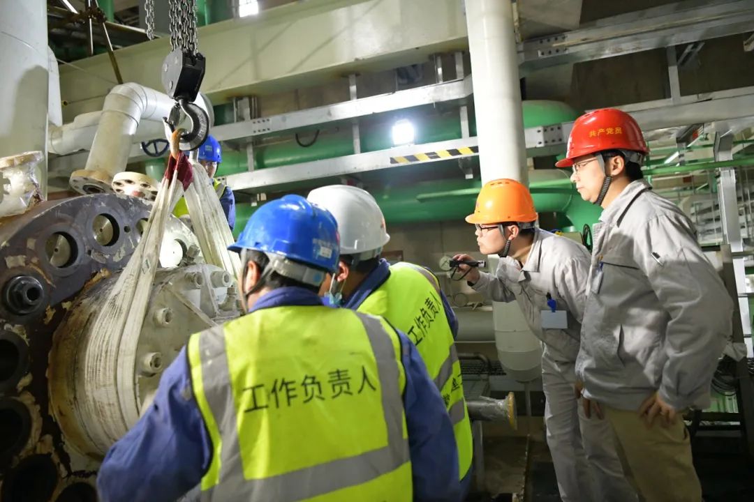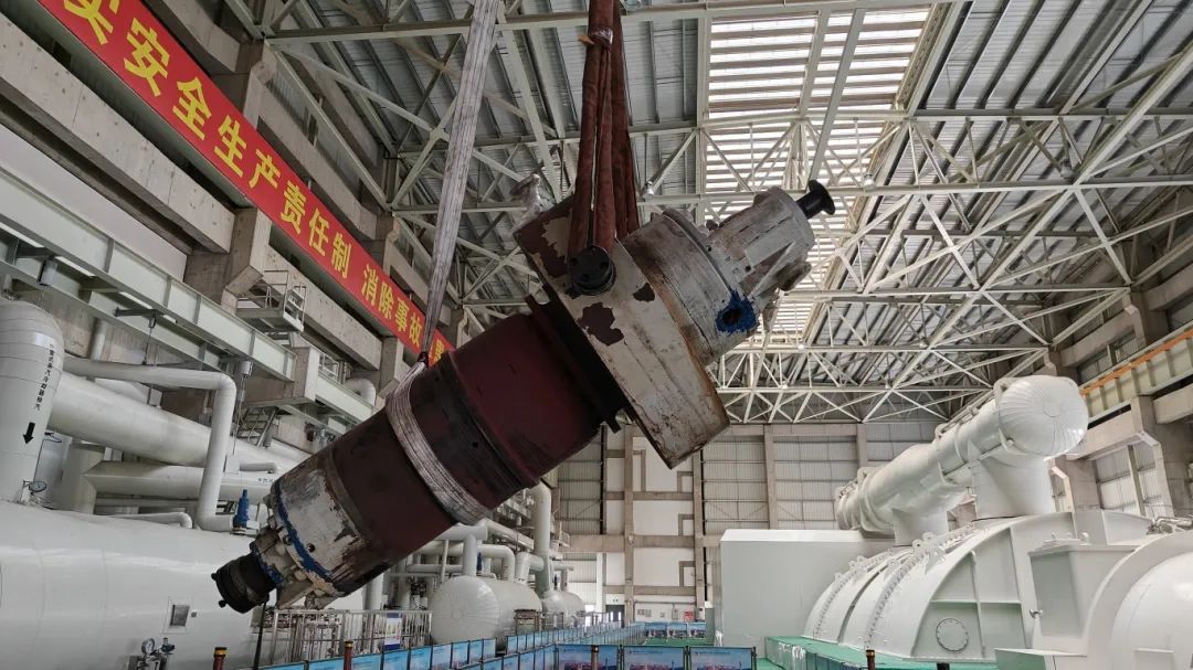 在抽芯包期间,公司加强现场管理,公司分管生产领导及生产技术部、设备管理部相关人员冲锋在前、驻扎现场,牢牢把控作业风险,及时排解抽出过程中出现的技术难点。整个过程花费两个半小时,分为芯包水平抽出和倾斜吊出两个阶段。由于是毫米级的操作精度,仅在水平抽出阶段便花费2个小时,考验的是大家的“绣花功夫”,需要时刻注意芯包与泵壳间隙,防止发生摩擦,被“检修人”形象地比喻为“穿针引线”。