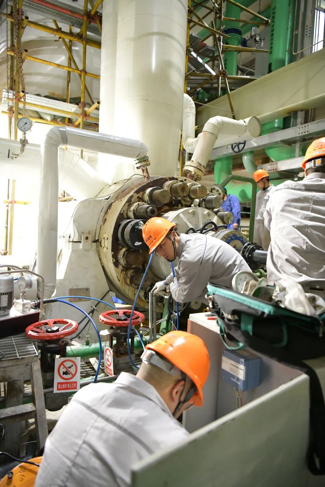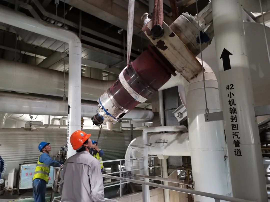 由于多方联动聚合力,仅用两天时间,便拆除了6根润滑油管道、5根密封水管道、多个相关热工测点,同时取下汽泵自由端端盖上7根“胳膊粗”的大螺栓、16个螺栓螺帽,为后续抽芯包工作争取宝贵时间。