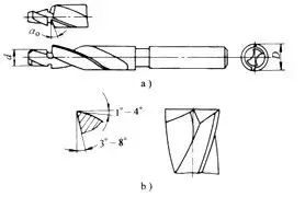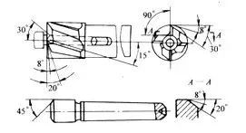 1)柱形锪钻如图2所示,主要用于锪圆柱形沉孔。用麻花钻改制的柱形锪钻如图3所示。