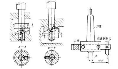 3)端面锪钻简单的端面锪钻如图5所示,刀片由高速钢刀条磨成,装入刀杆后用螺钉紧固。多齿端面锪钻 如图6所示。