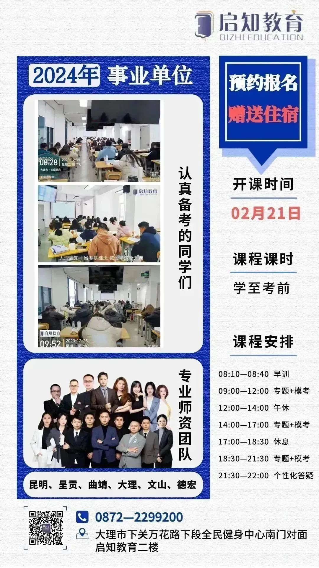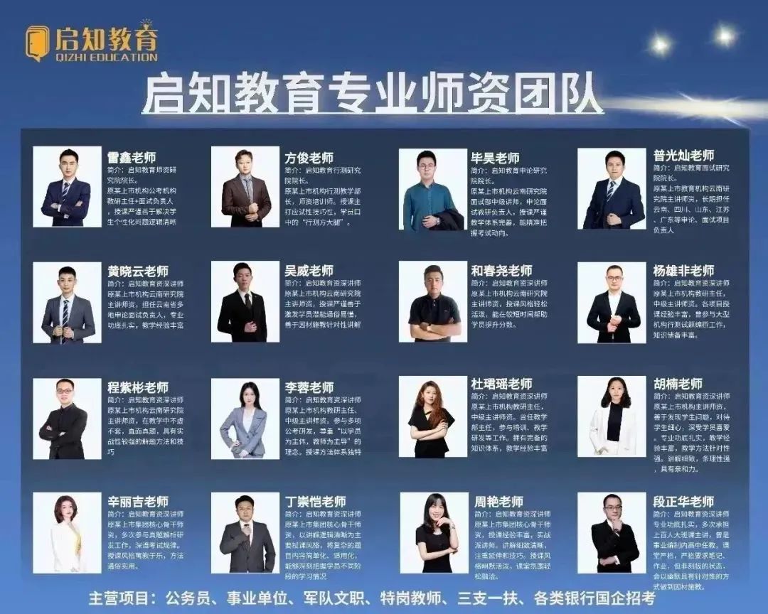 启知教育,作为一家云南本土公职教育机构,秉承“教育启迪智慧,知识引领未来”的办学理念,坚持“启学育人,知行合一”的教育信仰,以全面的公职项目、专业的教学服务、优质的教育资源为核心竞争力,在云南这片美丽的土地上,致力为广大学子提供一流的教学质量和一流的教学服务。自发展以来,服务内容已涵盖公务员、事业单位、三支一扶、特岗教师、西部志愿者、国企招聘、军队文职、金融银行等各项招考项目,为广大考生提供一站式的公职考试培训服务。