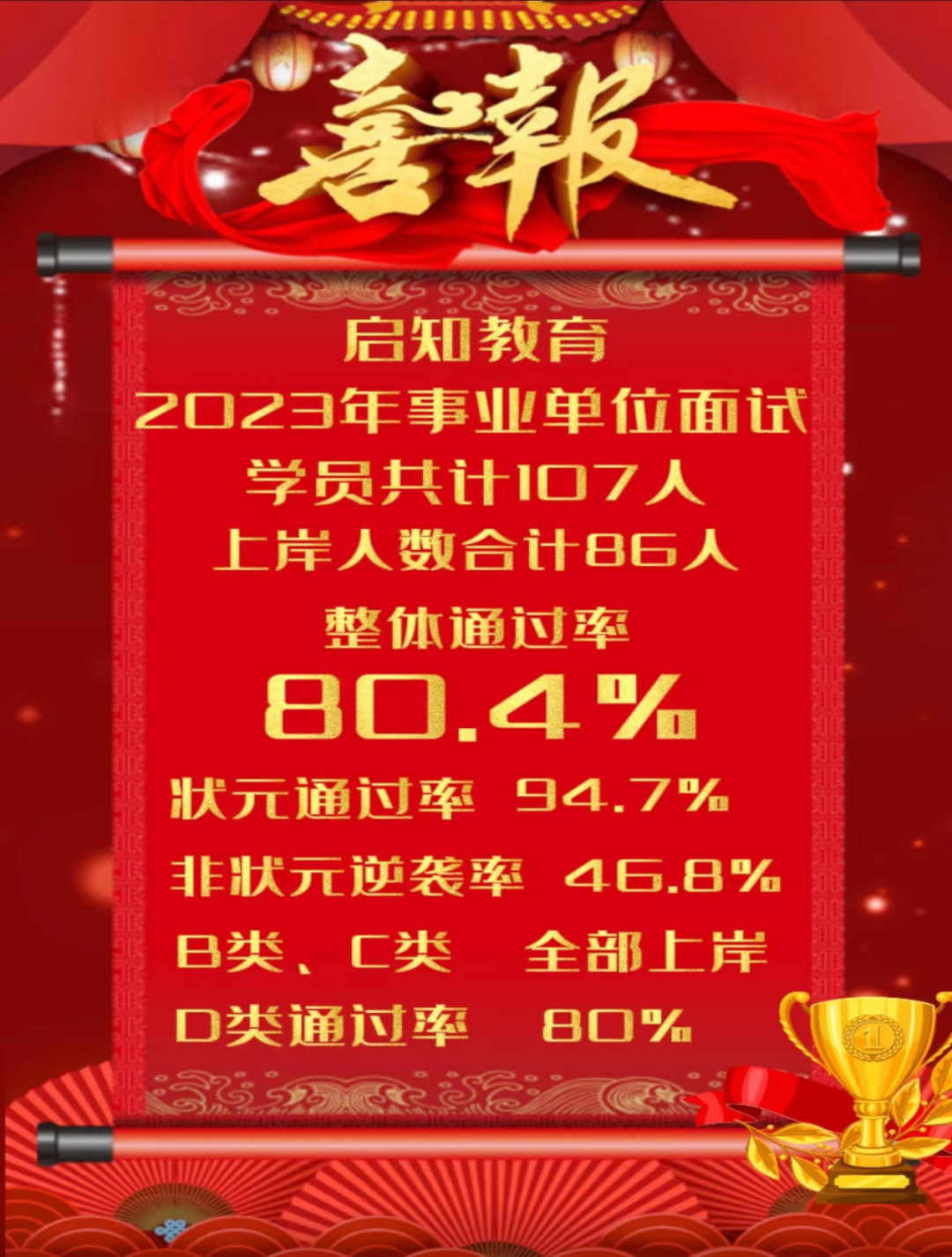 2023年度事业单位面试学员总107人,面试共上岸86人,通过率达80.4%,状元通过率94.7 % ,非状元通过率46.8 %。