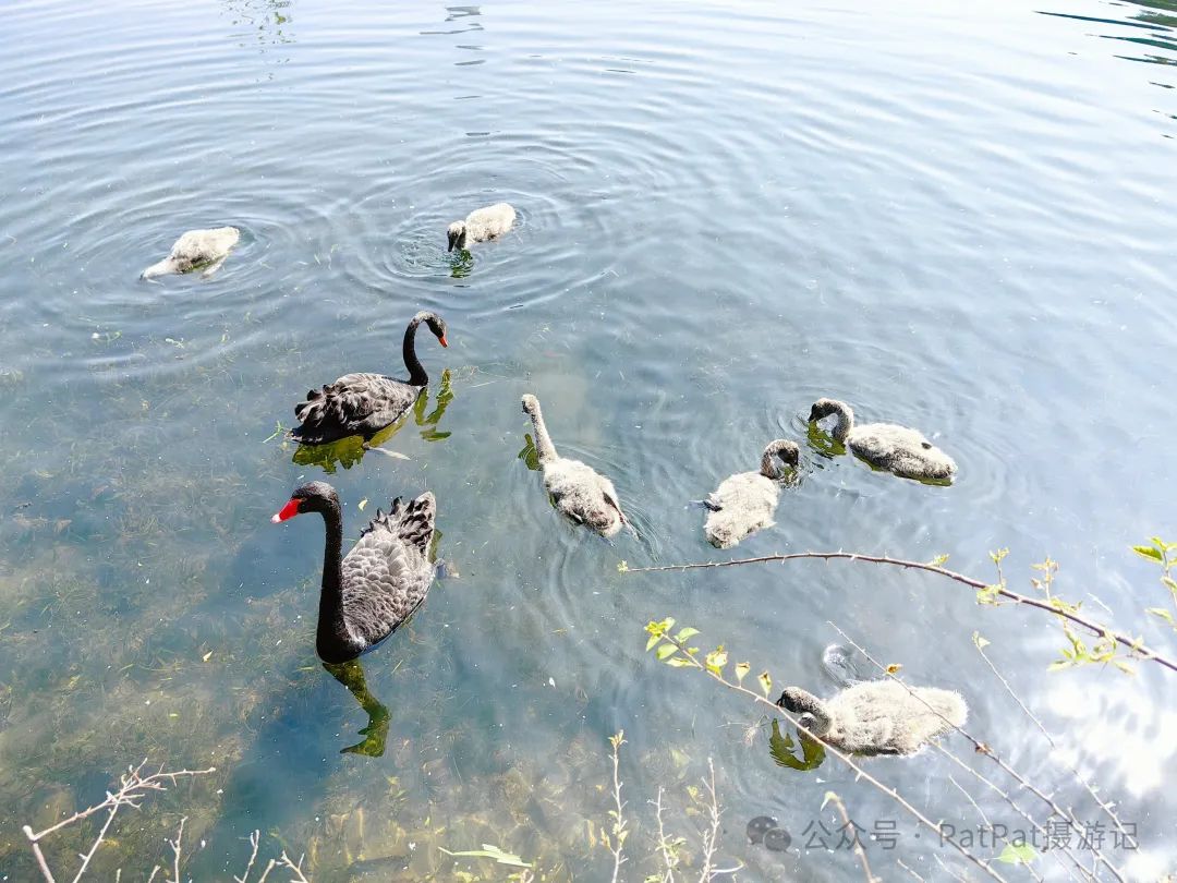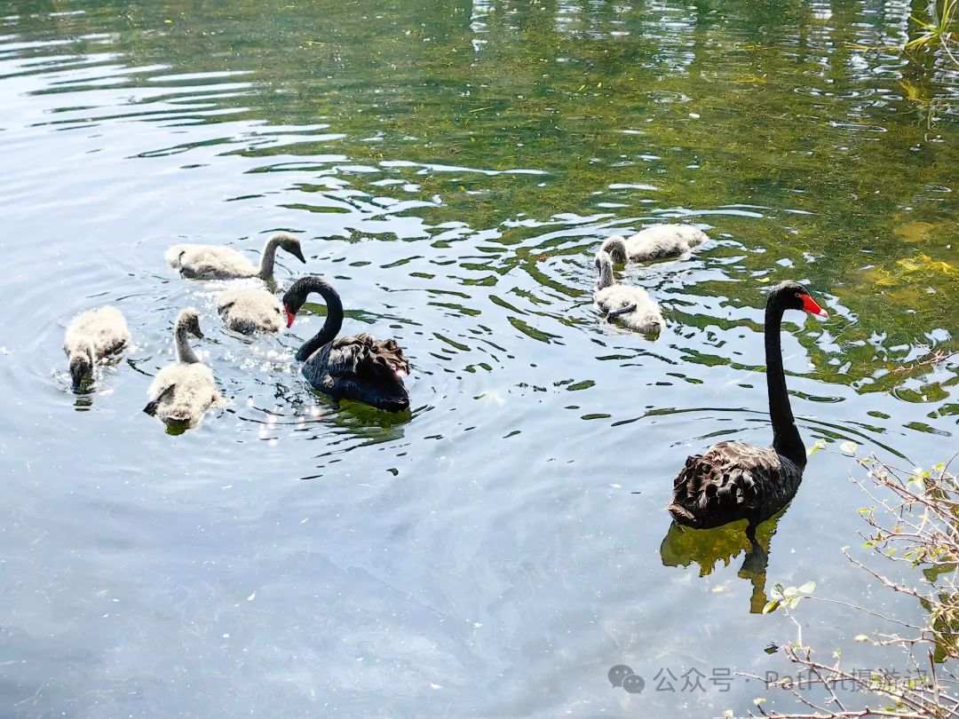 流花湖里的黑天鹅夫妇,又生了6只小宝宝,一家八口,乐也融融。
