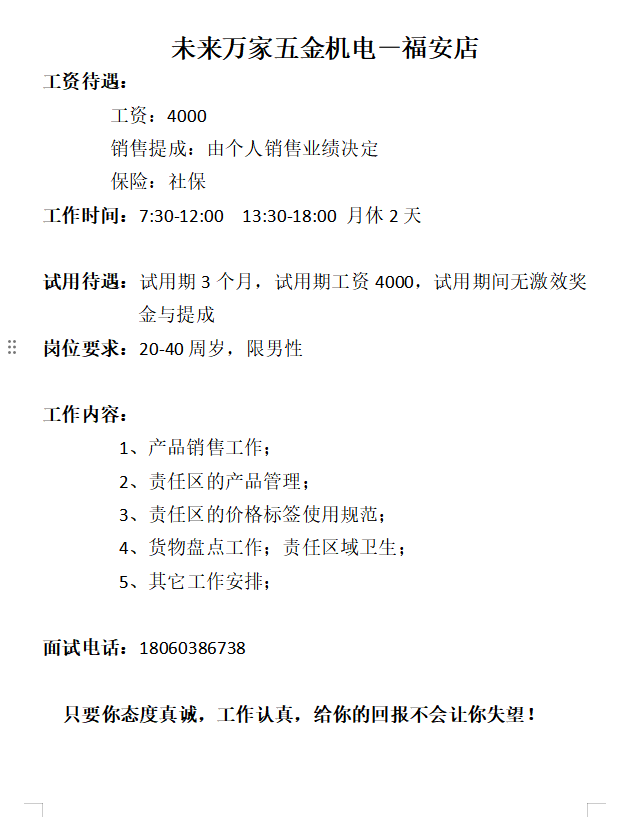 职位描述:未来万家五金机电一福安店 工资待遇: 工资:4000 销售提成:由个人销售业绩决定 保险:社保 工作时间:7:30-12:00 13:30-18:00月休2天 试用待遇:试用期3个月,试用期工资4000,试用期间无激效奖 金与提成 岗位要求:20-40周岁,限男性 工作内容: 1、产品销售工作; 2、责任区的产品管理; 3、责任区的价格标签使用规范; 4、货物盘点工作;责任区域卫生; 5、其它工作安排; 面试电话:18060386738 只要你态度真诚,工作认真,给你的回报不会让你失望!