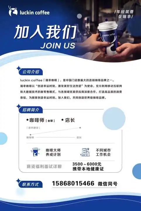 (长按二维码查看详情)▼【瑞幸咖啡招聘店员】3500-5500元 招聘2人