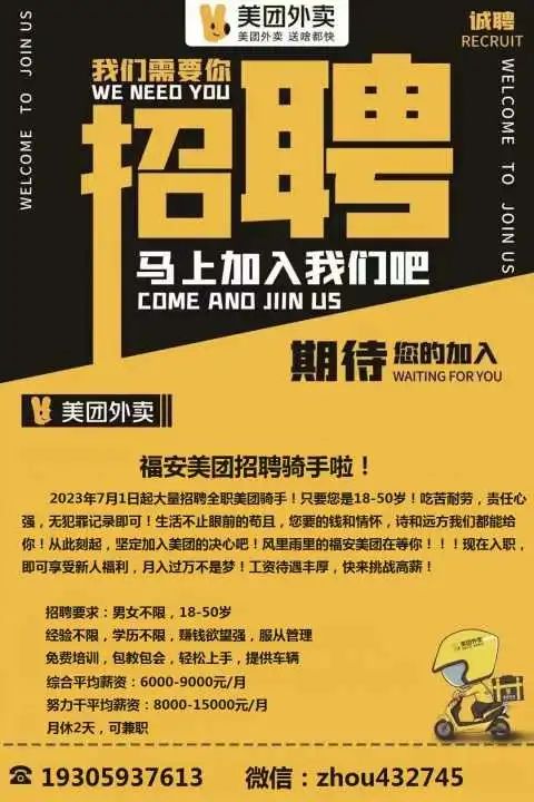 职位描述:生活不止眼前的苟且,您要的钱和情怀,诗和远方我们都能给你!从此刻起,坚定加入美团的决心吧!风里雨里,福安美团在等你!!!只要您是在18-50周岁之间,拥有一辆摩托车或电动车(如若没有,可选择租车)顺便带好您的身份证和智能手机,您就拥有了加入我们资格!没错,就是那么简单!包教包会!半小时上手!现在入职美团骑手,及可享受新人福利!综合薪资6000-12000/月;欢迎各位踊跃推荐!福安美团长期大量招聘美团骑手!寒假工!(至少干满一个月) 要求:年龄18周岁~50岁者均可, 吃苦耐劳、责任心强、无犯罪记录即可 工资待遇丰厚,有意者联系 联系电话:19305937613 微信: zhou432745