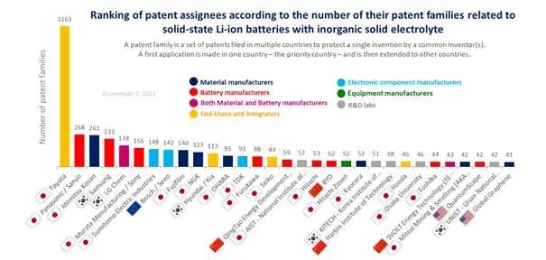 在竞逐全固态电池产业化“圣杯”的竞赛中,日本是一个最常被提及的参照对象,从专利数据看,目前日本在全固态电池领域专利布局优势明显,丰田、松下、出光兴产分列全球前三大专利持有人,且相互之间还有着长期而密切的商业合作,如丰田公司的车用镍氢电池、锂电池,就主要来自于其与松下合资组建的Primearth、Prime Planet公司,而其固态电池技术早在2013年就已与出光兴产开始联合研发。