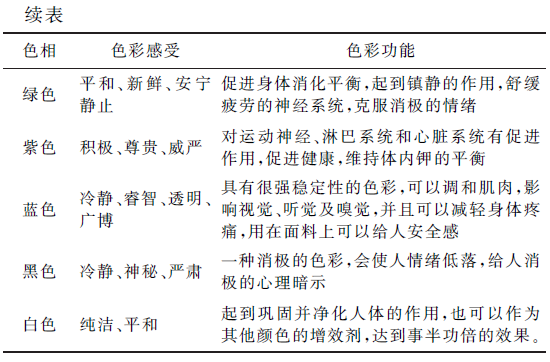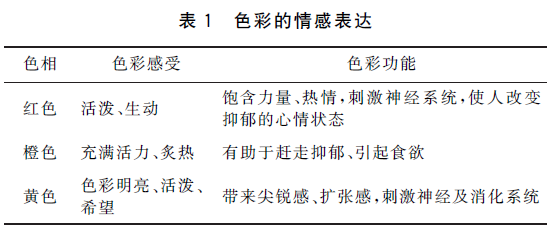 不同的色彩展现的色相不同,给人的心理感受也不同。直观来说,色彩分为冷色调、暖色调。顾名思义就是颜色带给人的温度感受。在服装设计中,这种冷暖色的区分最为明显,在冬季的服装中常采用暖色调,使人感受到温暖;在夏季的服装中,常看到的就是冷色调的使用,带给人们冰凉感[3]。常见的色彩情感表达见表1[4]。