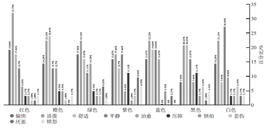 为探究不同的色彩会对人的情绪产生什么样的影响,设置“请您根据自己的情况,对下列色彩使您感到的情绪做出选择”这个问题,意图了解人们对某种色彩的直观感受。如图9所示,大多数受访者对红色、橙色、绿色、蓝色、白色都会产生愉快、活泼的情绪感受,不同的个体对不同色彩的情绪感受也存在着一定的差别。由此可见,色彩在治愈人情绪方面是有一定的作用的。