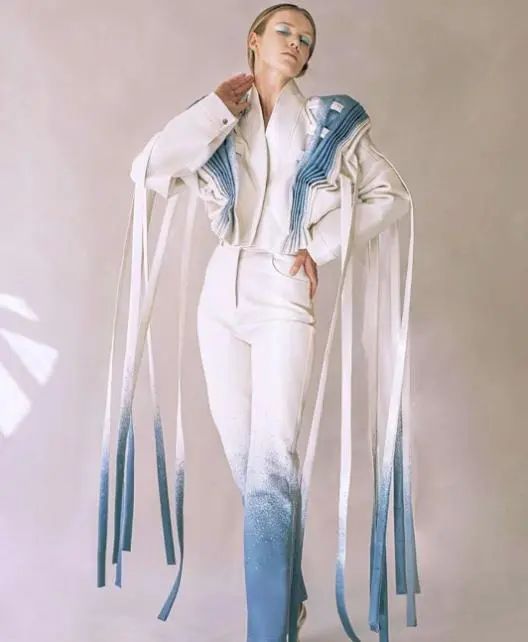 Polina采访了被诊断患有临床抑郁症的人,探讨了他们在“困难时期”决定穿什么服装,以及如何将自己的情感依附在服装上。她研读了很多关于色光疗法的学术文章,还在Instagram 上进行了一项民意调查,询问人们认为哪种颜色更令人振奋,以及他们对此的感受。她的设计致力于营造一种宁静感,让穿着的人感到舒适、宁静,以及被保护的感觉,从而获得情绪上的调整。比如图2这款上衣,Polina受到窗帘的启发,着重强调打褶的部分,用蓝色模拟海洋,随着褶裥层层递进的蓝色使“海洋”运动起来。蓝色本身能对人的情绪起到积极作用,而蓝白渐变打褶的设计又使得这些“褶裥”更加突出,可以说二者是互为助力,为有情绪问题的人们提供帮助,疗愈他们的身体和心灵。