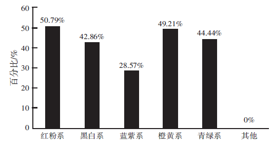 在调查问卷中设置了“您认为色彩对您的情绪有影响吗?”这样的问题。如图5所示,76.19%的人们认为在生活中色彩对他们的情绪产生过影响。同时,进一步了解到,不同的个体对色彩的心理认知感受是不同的。对于什么样的色彩可以令人的情绪放松这个问题,50.79%的人选择了红粉色系,但是其他色系比如青绿、橙黄的选择比例比较平均,如图6所示。
