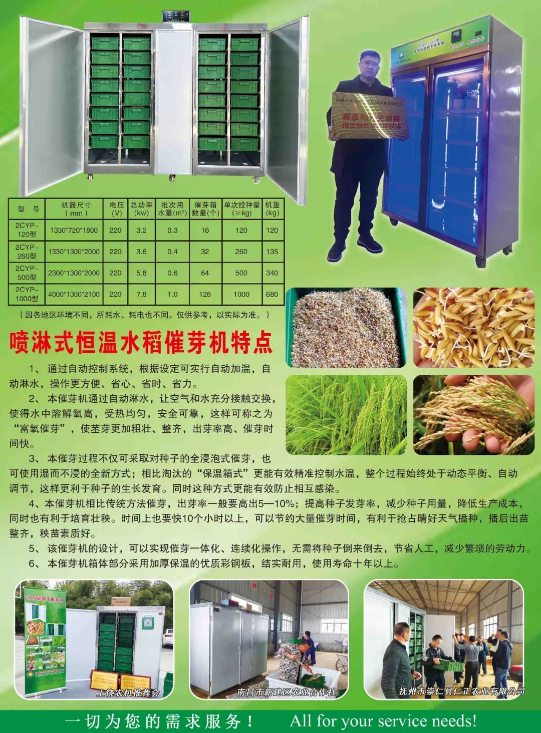 青州四季阳光机械有限公司,位于古九州之一的青州市,公司始建于2016年11月12日,注册资本500万,青州市外汇收入百强企业。目前本公司占地面积6000余平方米,其中车间建筑面积2000平方米,办公楼面积500平方米。现有职工16人,其中专业技术人员4人,高级工程师5人,高层管理人员3人。公司知识产权专利2项:种子发芽机专利(专利号201921839722.0),集装箱水培种植系统专利(专利号:201921851229.0);公司生产的主要产品有:水稻催芽机、玉米种子催芽机、全自动发芽机、大型育苗生产流水线设备、育苗种植机等。设备出口30多个国家和地区,年外汇收入五百万美元以上。企业形成了完整的管理体系,从原材料采购、产品设计到设备产出都配备完整的跟踪、检验、监督机制,同时人才资源的分配与专业技术人员的管理共同为产品质量的保障和企业的发展奠定了良好的基础。