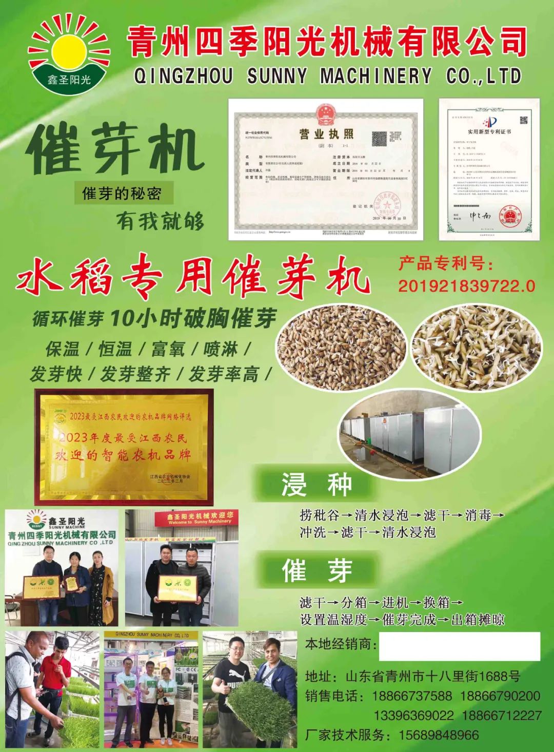 此外,青州四季阳光机械有限公司是中国管理科学院城市发展战略研究所芽苗系实践基地、中荷无土栽培学校芽苗系实践基地,有资深育苗催芽培育专家为客户进行培训,免费提供生产技术,客户可先参观学习。目前,本公司与中荷无土栽培学校联合办学30期,培训国内学员10000余人,海外学员80余人(新加坡、澳大利亚、阿曼、马来西亚、柬埔寨、俄罗斯、卡塔尔、英国、乌克兰、老挝)。公司地址位于:山东省青州市开发区十八里街1688号;真诚欢迎各位领导莅临洽谈,合作共赢,共创辉煌。