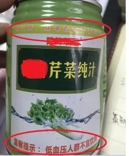 某地市场监管局接到举报,称下图1的××芹菜纯汁包装上印有“怕三高,就喝××芹菜纯汁”“温馨提示:低血压人群不宜饮用”宣称涉嫌违法。
