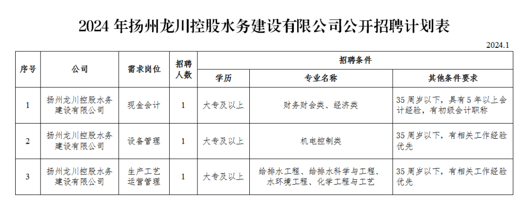 本次招聘共3人,岗位详见《扬州龙川控股水务建设有限公司公开招聘计划表》。