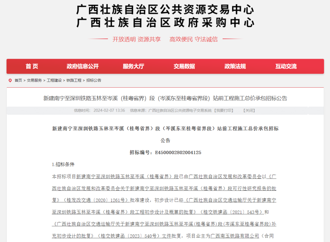 2月7日,《新建南宁至深圳铁路玉林至岑溪(桂粤省界)段(岑溪东至桂粤省界段)站前工程施工总价承包招标公告》发布。