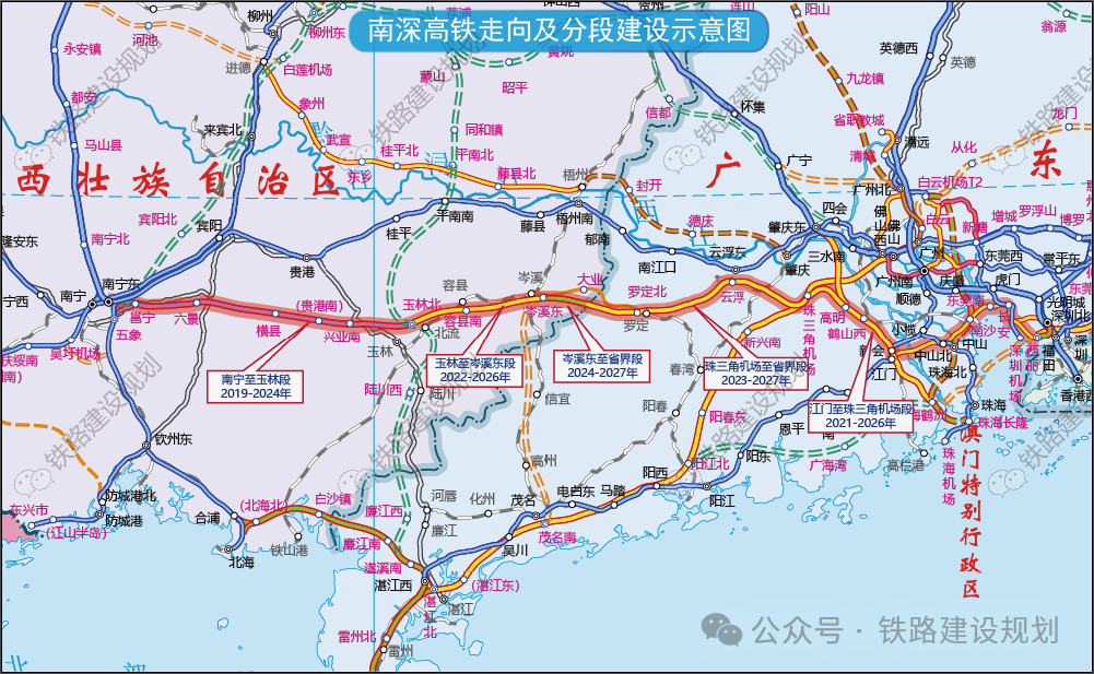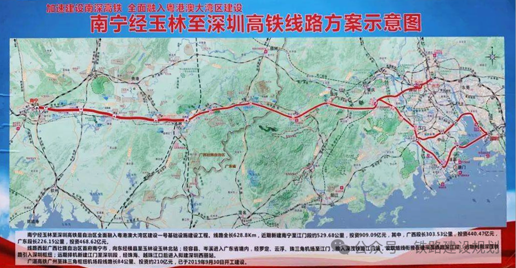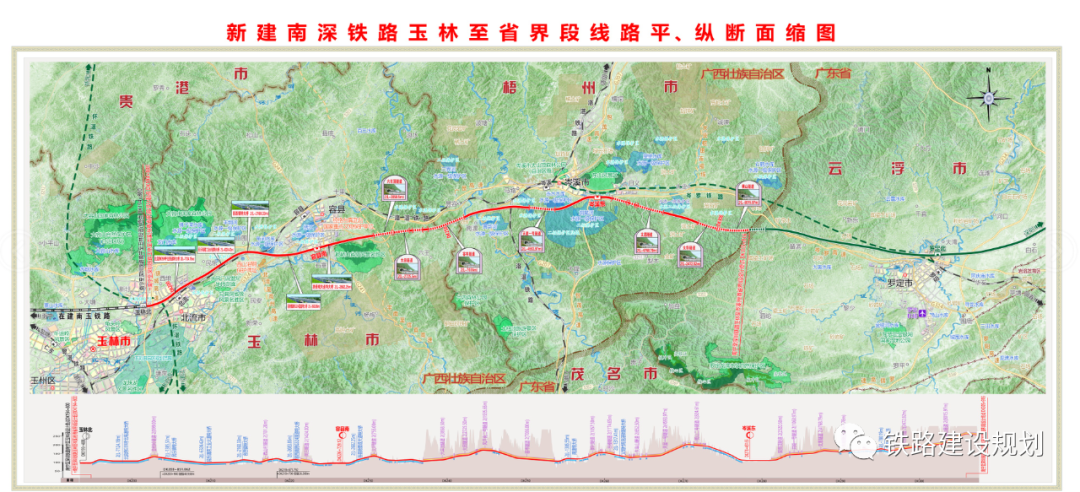 南深高铁广西岑溪东至桂粤省界段即将正式开工,计划工期4年。南深高铁是广西全面融入粤港澳区建设一号基础设施工程,也是广东、广西间继贵广、南广之后的第三条高铁通道。线路全长约660公里,其中新建南宁至江门段约544公里,利用在建深圳至江门铁路约116公里。目前,南深高铁广西境内的南宁至玉林至岑溪东段和广东境内的江门(珠海)至珠三角枢纽机场至省界段均已开工建设,其中南宁至玉林段计划今年建成通车,全线有望在2027年年底前建成。新建南宁至深圳铁路玉林至岑溪(桂粤省界)段已由《广西壮族自治区发展和改革委员会关于新建南宁至深圳铁路玉林至岑溪(桂粤省界)段可行性研究报告的批复》(桂发改交通〔2020〕1261号)批准建设;初步设计已经《广西壮族自治区交通运输厅关于新建南宁至深圳铁路玉林至岑溪(桂粤省界)段工程初步设计及概算的批复》(桂交铁建函〔2021〕543号)和《广西壮族自治区交通运输厅关于新建南宁至深圳铁路玉林至岑溪(桂粤省界)段(岑溪东至桂粤省界段)补充初步设计的批复》(桂交铁建函〔2023〕540号)文件批复;项目业主为广西南玉铁路有限公司(合同签订单位),建设资金来自业主自筹+银行贷款,项目出资比例为 100% 。新建南宁至深圳铁路玉林至岑溪(桂粤省界)段自在建南宁至玉林段铁路玉林北站引出,沿洛湛铁路向东至容县,跨洛湛铁路、国道G324后设容县南站,再跨国道G241,沿洛湛铁路南侧过岑溪,设岑溪东站后至省界。新建正线长111.04公里,设3个车站,其中玉林北站为在建车站,容县南站、岑溪东站为新建车站。主要技术标准:线路等级:高速铁路。正线数目:双线。设计速度:350公里/小时。招标范围:岑溪东(不含)至省界段:DK279+770~DK307+156,线路长度25.414km。标段划分:新建南宁至深圳铁路玉林至岑溪(桂粤省界)段(岑溪东至桂粤省界段)站前工程施工总价承包招标分1个标段,即YCZQ-5标段。根据项目规划,南深高铁南玉段预计2024年6月通车运营,玉岑段预计2026年6月完工通车,广东段预计2027年完工通车。