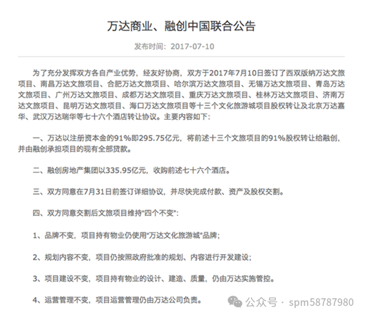2017年7月10日,王健林一次性售出万达13个文旅项目及76个酒店给融创和富力,通过这次资产转让万达的负债大幅下降,回收资金全部用于还贷,万达商业清偿了绝大部份的银行贷款。顺利解决了万达的流动性危机。