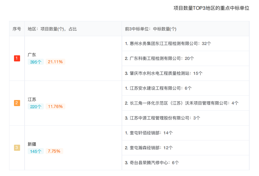 2、【全国】【水利工程】 项目数量 TOP3 地区的重点中标单位;