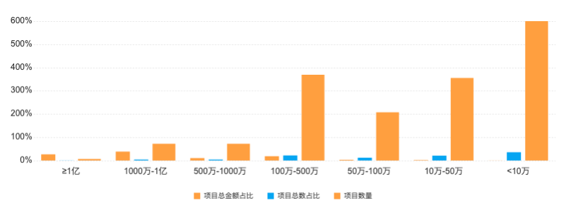 项目金额<10万的项目数量为:600个;