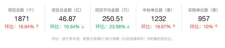 市场主体方面,本年中标企业总数为1232家,环比上年增长16.67%;完成招标采购的采购单位总数957家,环比上年增长10%;