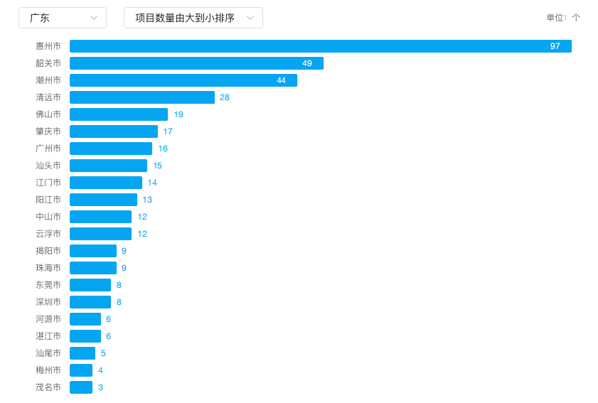 本年,广东水利工程领域招投标项目数量方面,惠州市、韶关市、潮州市中标项目较多,分别达到97个、49个、44个,前3个城市占广东水利工程领域项目数量的48.10%。