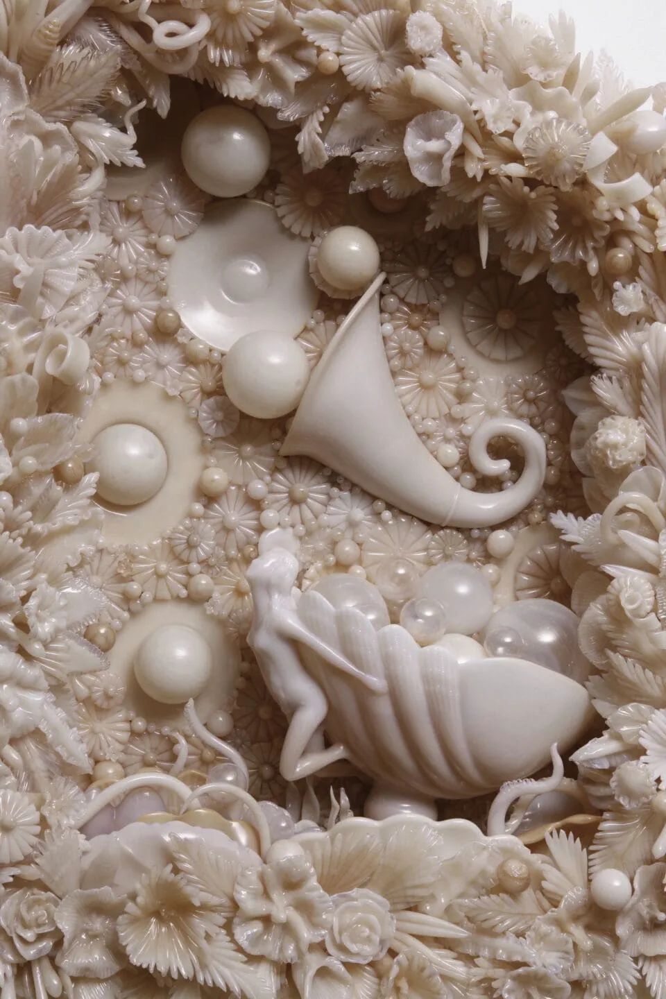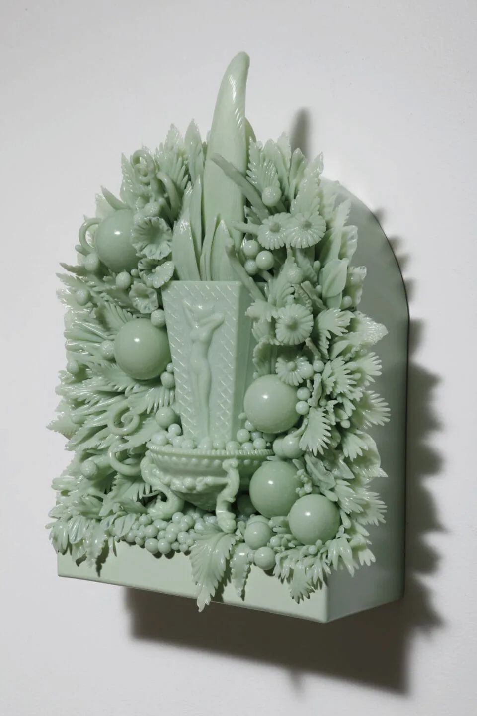考恩在其复杂的壁挂作品和独立雕塑中专注于这种艺术遗存,并同时强调了这种材料的巨大潜力。器皿、通俗摆件和装饰物由此转变为以女性气质、变化和怀旧为中心的奇幻组合。考恩从旧货店、网络或朋友处收集玻璃,不论是带有火工工艺烧制的碎玻璃的古董,还是能够重新熔化的废弃材料。有时,人们会捐赠一些东西,想看看它们如何在艺术作品中重生,而许多材料来源于已经倒闭的地区制造商,其独特的色彩将永远不会重现。