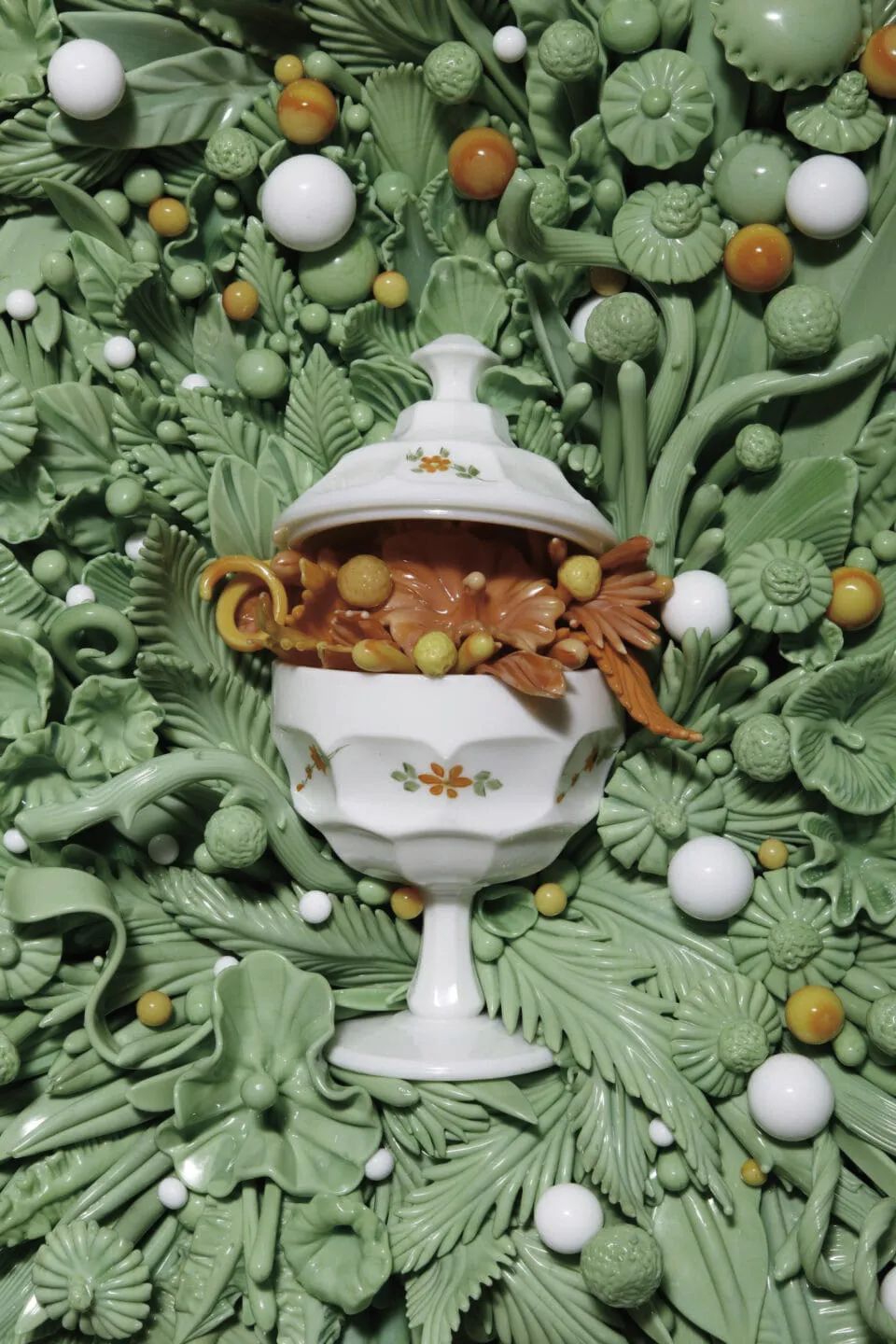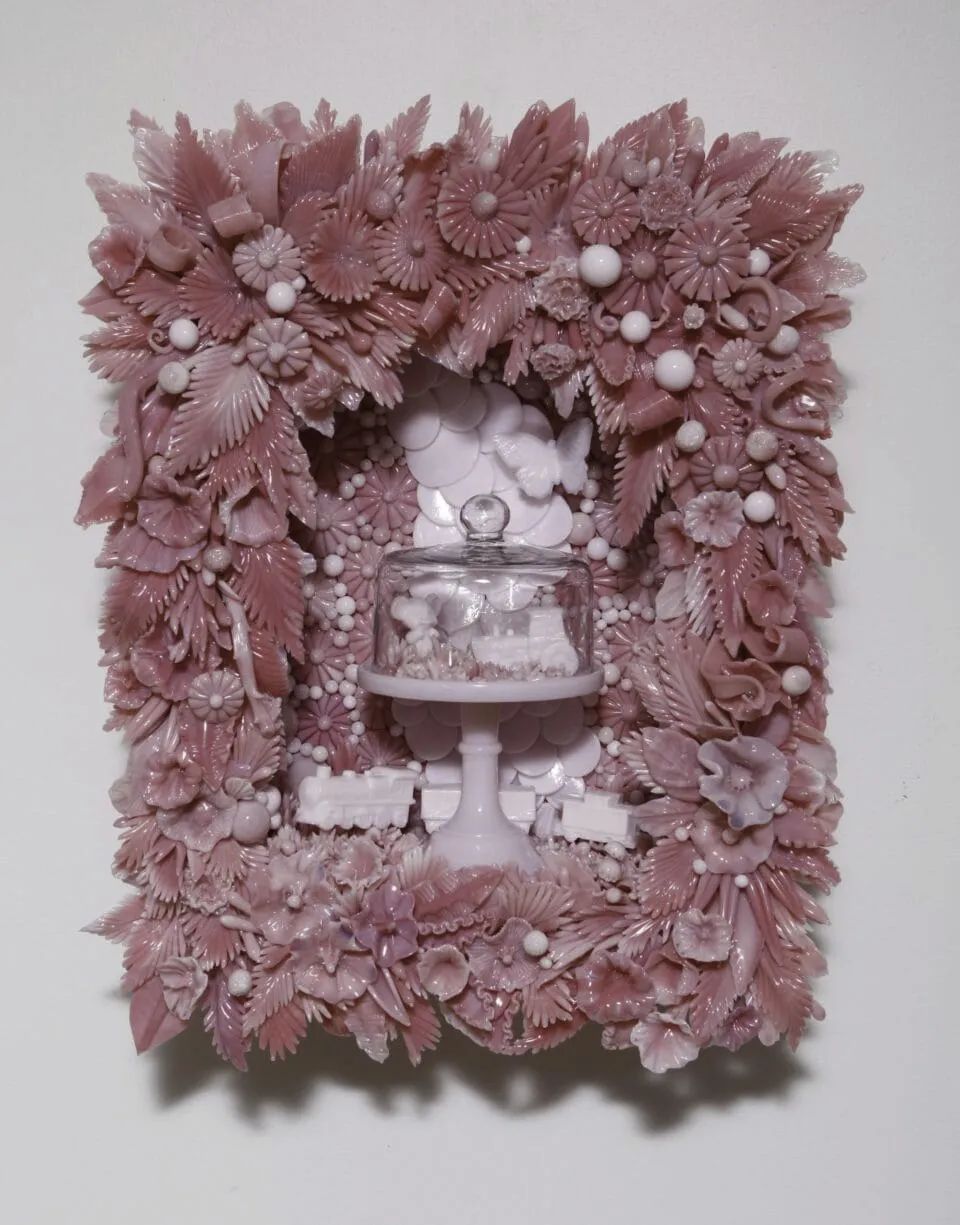 安博·考恩通过精心细致的创作将复古玻璃回收重塑为枝繁叶茂、充满怀旧气息的雕塑作品。本文展示的许多作品组成了这位艺术家的展览“装饰的炼金术”的一部分。该展览目前正在惠顿艺术(译者注:一家历史悠久的玻璃制造厂)的美式玻璃博物馆展出,深入揭示了玻璃器皿从流行到衰落的各个阶段。展览声明这样写道:“到20世纪末,曾经风靡于美国家庭的廉价压制乳白色和彩色玻璃糖果罐、花瓶和新奇物品已经失宠。”