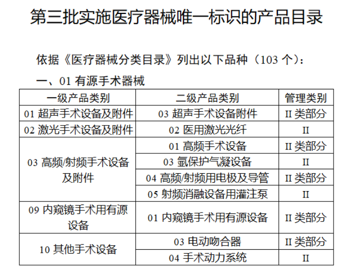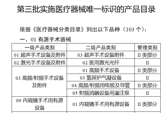按照风险程度和监管需要,确定部分临床需求量较大的一次性使用产品、集中带量采购中选产品、医疗美容相关产品等部分第二类医疗器械作为第三批医疗器械唯一标识实施品种。
