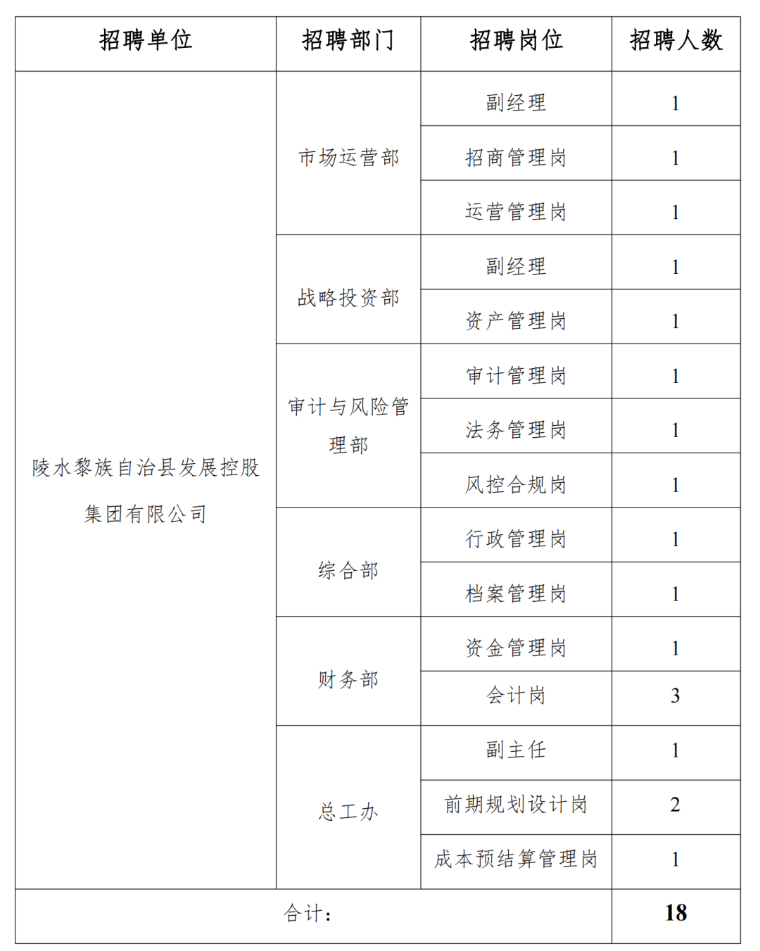 为进一步加大人才引进力度,加强干部队伍建设,满足业务发展需要,陵水黎族自治县发展控股集团有限公司现面向社会公开招聘,有关事项公告如下。