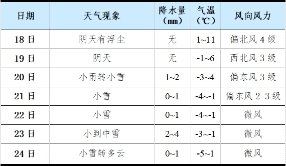 日平均气温下降 8℃左右,最低气温可降至-5~-4℃,20至24日将维持雨雪低温天气;过程期间伴有4级左右偏北风,阵风可达6级以上;过程期间降水相态复杂,伴有雨雪转换。