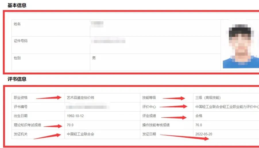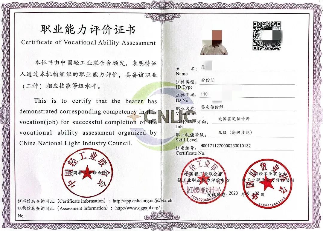 该证书由中国轻工业联合会、中国轻工业联合会轻工业职业能力评价中心、中国轻工业联合会轻工业职业能力评价总站(中国旧货业协会)三大中字头单位统一盖章颁发。职业能力评价证书全国通用、权威性高、统一注册、唯一编号,官网查询,表明持证人通过职业能力评价,具备该职业(工种)相应技能等级水平。证书查询网址:http://www.qgpxjd.org证书官网查询页面