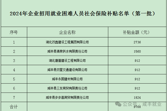 根据《财政部 人力资源社会保障部关于印发<就业补助资金管理办法>的通知》(财社发〔2023〕181号) 、《关于印发<就业补助资金及失业保险基金经办规程>的通知》(恩施州人社发[2023]2号)等文件规定,经数据提取比对,对事实的真实性进行审查、核实,拟对符合申领企业招用就业困难人员社会保险补贴(第一批)的7家企业给予补贴资金共计玖仟柒佰陆拾捌元整(¥:9768元),现将相关情况予以公示,公示期为5天(2024年2月19日至2024年2月23日)。