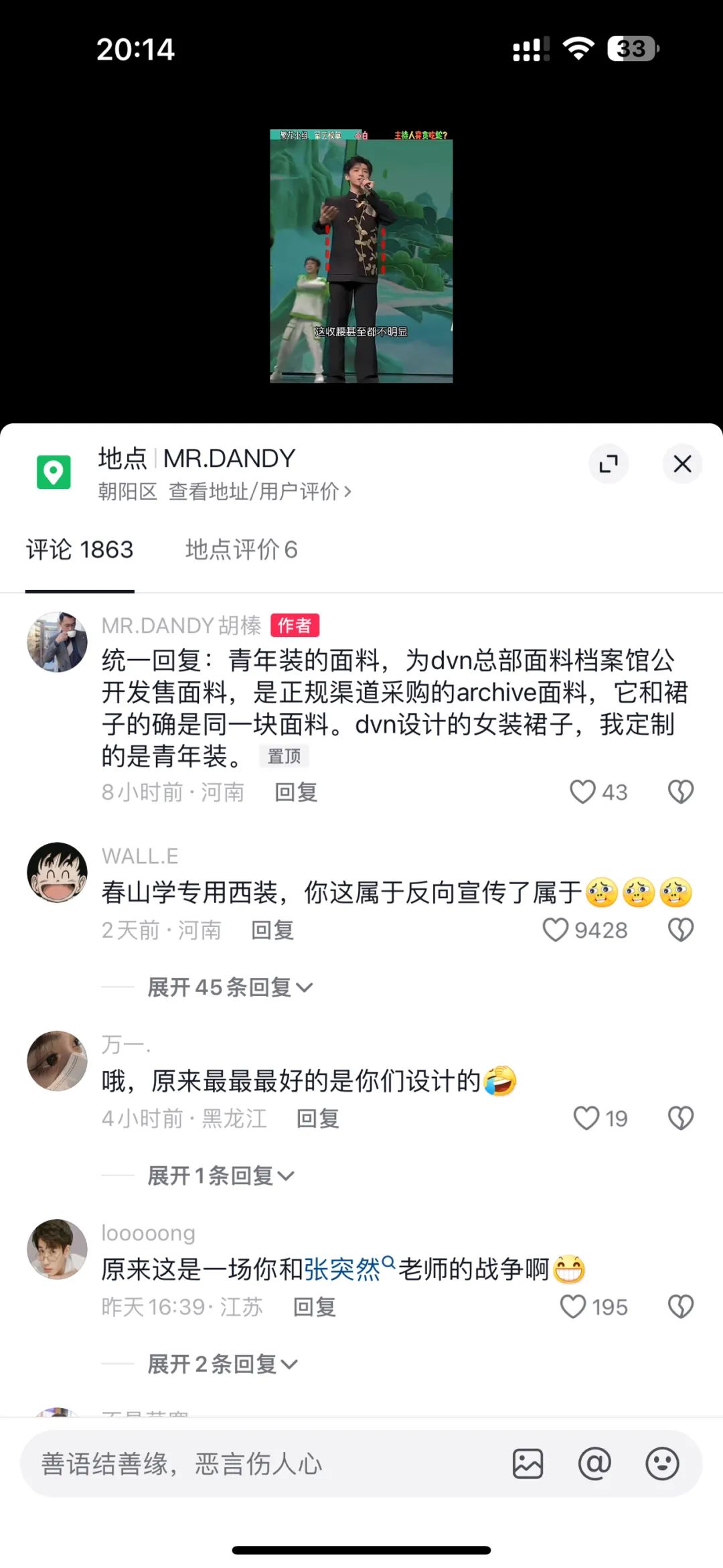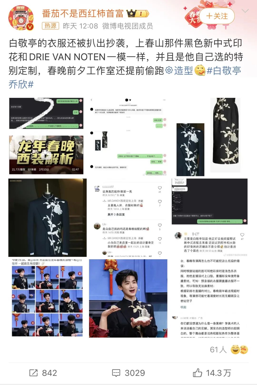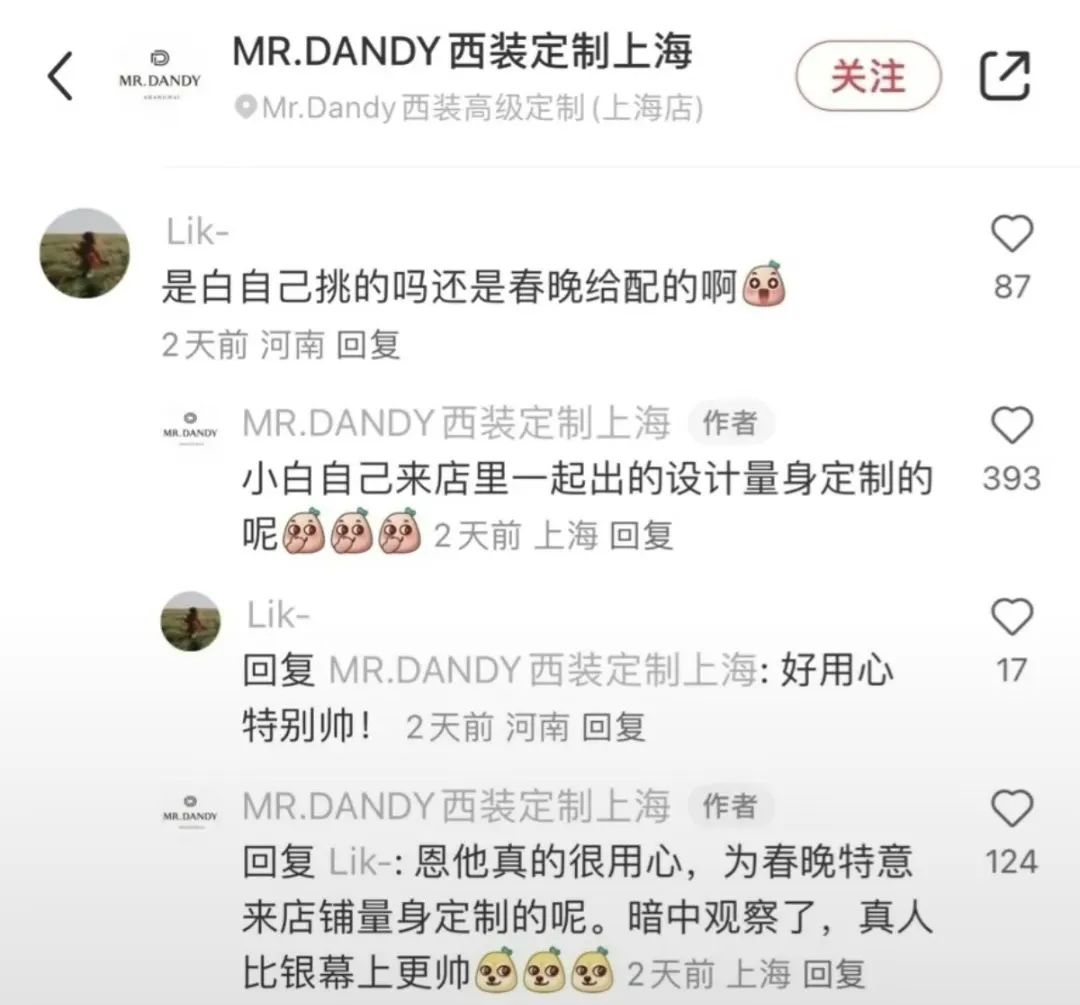 在一则视频里该设计师简单讲述了他设计的春晚小白的服装,抖音还得去找,不过他在视频号里也上传了该视频,大家可以看一下:?