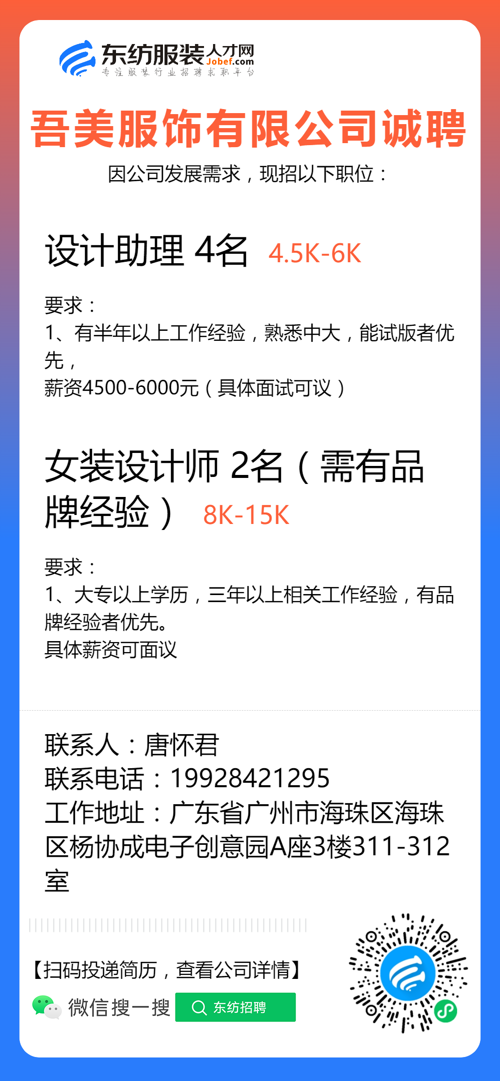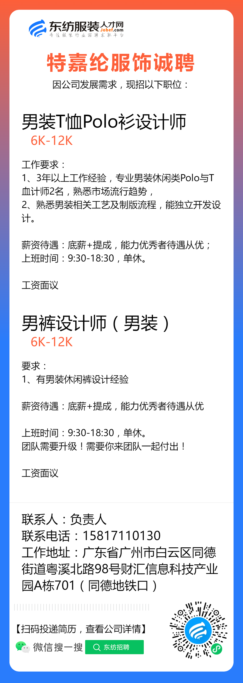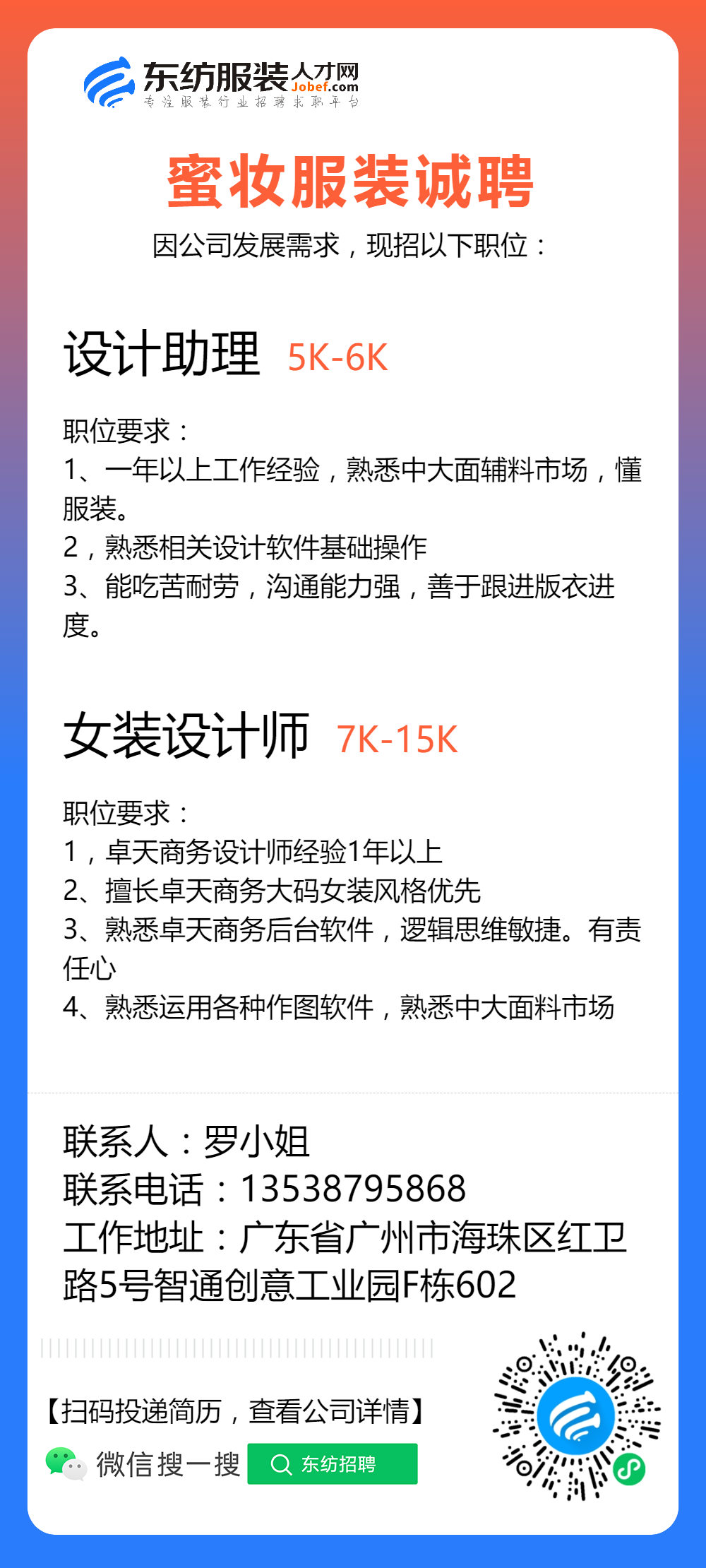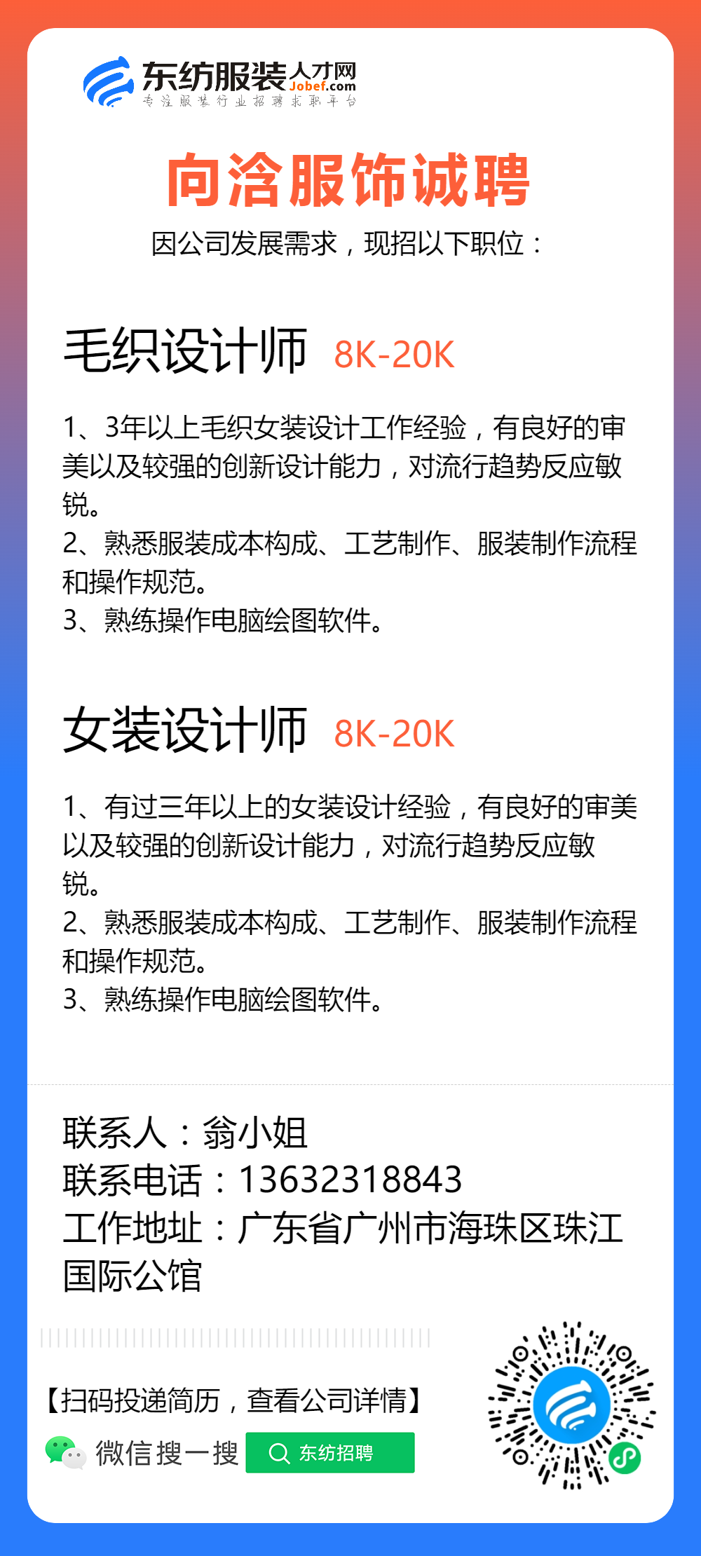 服装招聘·设计类丨2. 19号,女装设计师、男装设计师、童装设计师、设计助理.....