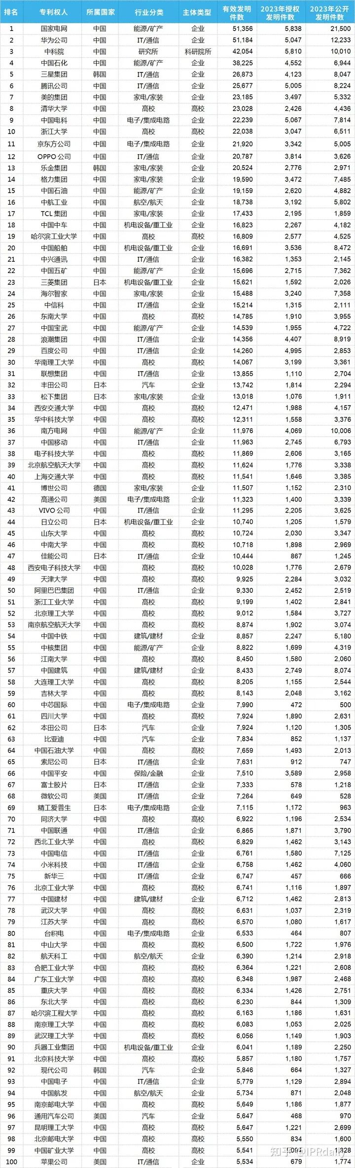 一、2023年度中国有效发明专利权利人排行榜TOP100