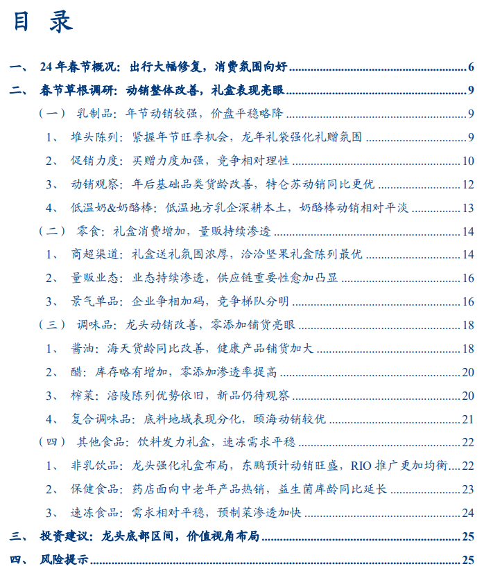 2024年春节概况:节日效应+假期延长,人流明显回升、消费氛围向好,礼赠品类及旅游餐饮等动销加快。相较于去年春节正处疫情放开初期的过峰阶段,今年春节扰动进一步收敛,加上受调休政策致假期延长,带动返乡客流同比继续明显回升,全社会跨区域人员流动量创下历史新高,同口径相比下分别较23年/19年增长14%/11%。消费层面则呈现出“先返乡、再旅游”的典型模式,一方面春节礼赠、宴席餐饮等恢复向好,另一方面年后旅游等显著改善,其中短途游继续火爆、出境游明显复苏,助推旅游餐饮及能量饮料等相关品类。整体看,尽管消费力或仍存掣肘,但节日效应+假期延长下,春节整体消费恢复向好:➢乳制品:年节动销较强,价盘平稳略降。在前期需求复苏偏弱背景下,龙头企业通过提前召开订货会、堆头陈列及定制礼袋增强礼赠氛围,配合加强买赠促销力度,紧握旺季动销机会。从草根调研来看,今年以高端白奶为代表的乳品整体动销较强,全国范围内节后新鲜度明显提升,龙头价盘稳中有降,但竞争相对理性。分品牌看,金典价盘略低,但春节前后货龄消化幅度大于特仑苏,安慕希动销略好于纯甄。➢零食:礼盒消费增加,量贩持续渗透。今年各零食品牌齐发力礼盒装,堆头陈列隆重,零食礼盒作礼品渗透率提升。其中洽洽和三只松鼠品牌露出度高于其他,洽洽产品陈列最优,三只松鼠价格带及铺货更为下沉。量贩业态则持续渗透加密,草根调研发现海南、云南等地区全国性连锁大品牌的标准化拓店和价格优势更强,供应链优势重要性愈加凸显。此外,企业竞相加码鹌鹑蛋、魔芋爽&素毛肚等景气赛道,当前竞争梯队分明,劲仔、盐津在鹌鹑蛋赛道优势明显,卫龙则为魔芋爽绝对龙头。➢ 调味品:龙头动销改善,零添加铺货亮眼。春节调味品整体动销改善,各企业终端库存表现分化。酱油方面,海天库龄同比去年降低,多数地区整体降至3.5-4.5月左右 (前年/去年同期约4月/5月),千禾尽管铺货继续增加,但对比看新鲜度有所下降,厨邦表现相对平稳、李锦记库存加大。醋方面恒顺动销平稳,货龄同比有所提升,榨菜库存基本与去年接近。此外,零添加产品陈列及曝光继续增加,产品定价中枢有所下移。而复调竞争延续缓和,终端库存良性,其中颐海及天味在铺货与动销上相对占优。➢其他食品:1)非乳饮品:饮料多加大礼盒装布局,且高性价比产品受欢迎,同时椰子水、无糖茶等风口赛道陈列明显强化。东鹏饮料春节系列专案落地高效,更体现公司强大执行力,预期动销表现旺盛。预调酒方面RIO陈列仍显著占优,且今年3-5-8推广力度更加均衡。2)保健食品:疫情后消费者健康意识提升,药店面向中老年的产品热销,益生菌热度在高基数下有所回落。3)速冻食品:整体热度平稳,米面制品动销强于火锅料,库龄均在2-3个月,部分城市竞争激烈,折扣力度同比加大,其余城市仍以配合商超满减活动为主。预制菜线下动销一般,部分产品货龄较大,但今年除夕不放假叠加宣传力度增强,一线城市动销环比有所提速。食品饮料行业投资建议:龙头底部区间,价值视角布局。