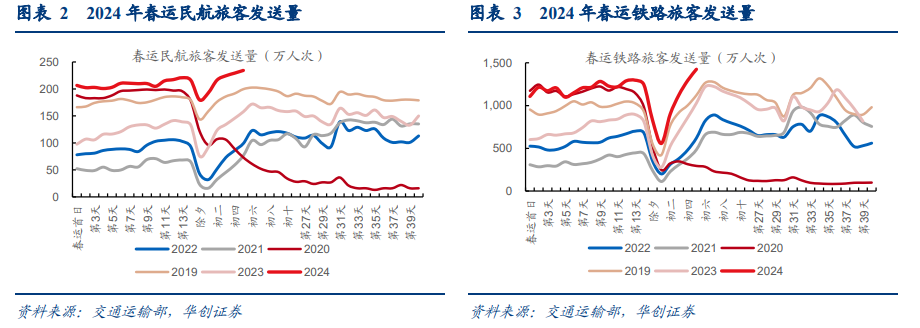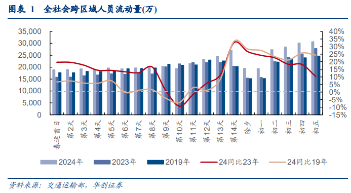 整体观感:今年春节假期延长,加上外部扰动消除,带动人流进一步回升,24春节整体消费氛围趋好。去年恰好处在疫情过峰阶段,今年扰动进一步减除,加上受调休政策影响,今年假期有所延长(不算除夕法定假期一共8天,23年7天),带动返乡客流同比23年继续回升[1],全社会跨区域人员流动量、民航、铁路、公路出行旅客均创下历史新高,春运前20天全社会跨区域人员流动量累计约45亿人次,同口径相比下,较2023年同期增长14%,比2019年同期增长11%,创下史上最火春运。消费层面则呈现出“先返乡+再旅游”的典型模式,一方面春节礼赠、宴席餐饮等恢复向好,另一方面年后旅游等显著改善,截至初五全国重点文旅景点游客较23年同期+22.8%。整体看,尽管年内消费力或仍在掣肘,但24春节整体消费恢复向好[2]。