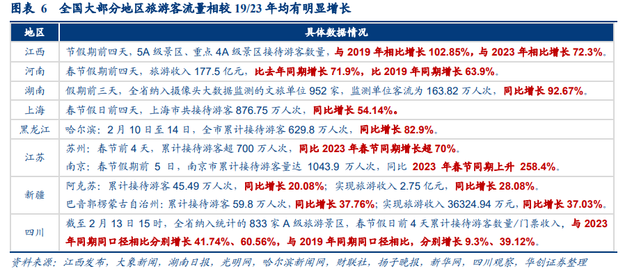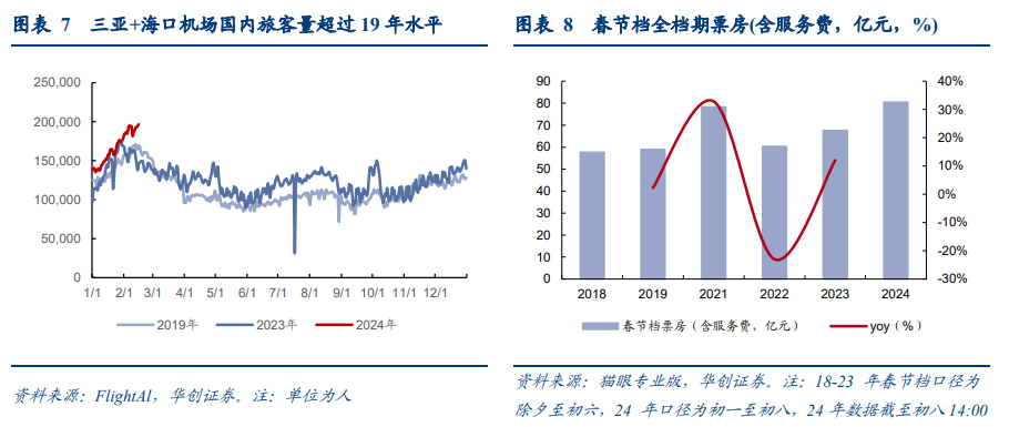 旅游消费进一步恢复,高端出境游及小城市增幅更加明显。往年初二、初三为出行低谷,但据去哪儿数据显示,24年春节假期节中无明显出行低谷,在假期天数延长+春节气候转暖带动下,初二至初四出行机票预订量反而较2023年增长六成,美团数据亦显示,今年春节旅游消费规模较2019年、2023年同期均有显著增长,其中出境游及小城市增幅更加明显。➢凭借不挤+不贵,小城市成春节旅游新去处。在返乡探亲、休闲出游等多重需求叠加和各地文旅促消费活动助力下,据去哪儿统计,今年多个“小机场城市[3]”订单增幅明显,大年初一至初三期间机票预订量同比增长近2倍。同程旅行平台数据也显示,初一至初四,全国主要县城的酒店预订量同比增长超120%。➢出境游及高端旅游恢复同样明显。据国家移民管理局预测,今年春节假期全国口岸日均通关人数较去年增长约3.3倍,与2019年春节出入境流量相当,同时携程数据显示,假期首日出/入境游订单均较19年明显增长。而24年春运海南客流整体同比增长在30%+,大年初一到初四离岛免税购物金额即达12.17亿(接近去年整个假期的八成)。[3] 指位于中国三线及以下城市(除去丽江、大理等热门旅游城市之外)的机场。