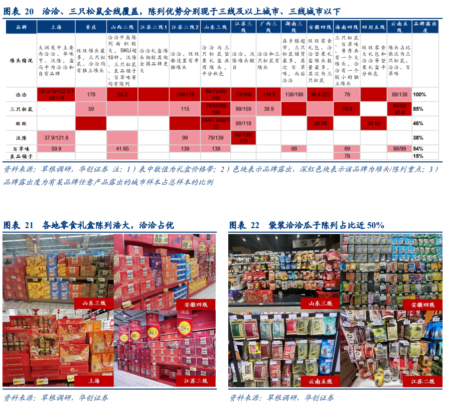 奶酪棒动销总体较为平淡,下沉市场表现更优。分品牌看,妙可蓝多和伊利铺货最广,远超百吉福和奶酪博士等品牌,其中妙可蓝多所铺货的SKU更为齐全,且在陈列面占比方面胜过伊利。常温奶酪棒仅在部分调研商超有铺货,该品类仍处于导入期。根据草根调研,各城市奶酪棒生产日期基本集中在10-11月,尤其是二三线城市节后与节前调研获得的多数产品生产日期相同,反映出春节期间消费没有明显增加,不过四五线城市表现较佳,预期为由于奶酪棒在下沉市场的受欢迎度正在提升。分规格看,各地大包装产品生产日期普遍晚于小包装,主要系大包装产品性价比较高。1、商超渠道:礼盒送礼氛围浓厚,洽洽坚果礼盒陈列最优各零食品牌齐发力礼盒装,堆头陈列隆重,零食礼盒作为赠送礼品渗透率提升。较往年,24年零食礼盒堆头陈列更加隆重,洽洽、三只松鼠、旺旺、沃隆、百草味、良品铺子等一众零食品牌推出多款礼盒及龙年定制礼盒,广泛陈列于各线城市商场中心显眼位置。受益于较强的送礼属性和年轻化、健康化送礼趋势,叠加诸多品牌的多款礼盒有10%-30%不等的较大折扣力度,坚果礼盒成为送礼优选,吸引大量人流,动销良好,销售人员补货频繁。根据草根调研,各地区赠送礼品中,零食礼盒渗透率提高,部分地区存在对其他礼盒的分流影响。洽洽陈列最优,三只松鼠铺货更为下沉。洽洽和三只松鼠品牌露出度极高,接近于全线铺货,在两者竞争中,洽洽价格带集中于79-138元之间,堆头陈列占比在三线及以上城市更高,而三只松鼠以略低的价格带59-115元发力下沉市场,在三线城市以下堆头陈列中占优,在乡镇超市中也有铺货。旺旺铺货也较全面,受众为小朋友的旺旺大礼包动销旺盛。沃隆铺货集中于三线城市及以上。