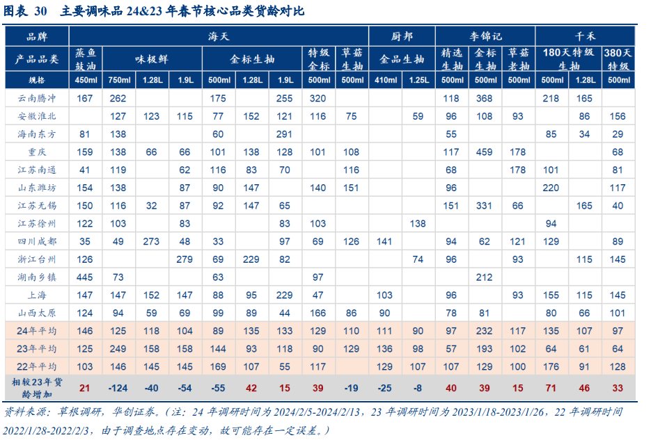 头部品牌酱油货龄接近,海天新鲜度明显提升,千禾货龄同比去年有所增加。根据草根调研反馈,今年春节期间部分地区,海天配备导购积极拉动销售,海天库龄同比降低,多数地区整体在3.5-4.5月左右 (前年/去年同期约4月/5月),味极鲜系列大包装货龄相对更好,整体动销较好,库存压力确实得到一定缓解。厨邦产品货龄略优于海天,基本在3.5个月左右,李锦记新鲜度相对落后,草根调研反馈货龄有所提升,而千禾由于去年受零添加事件影响导致货龄极低基数,对比看今年产品新鲜度有所下降。